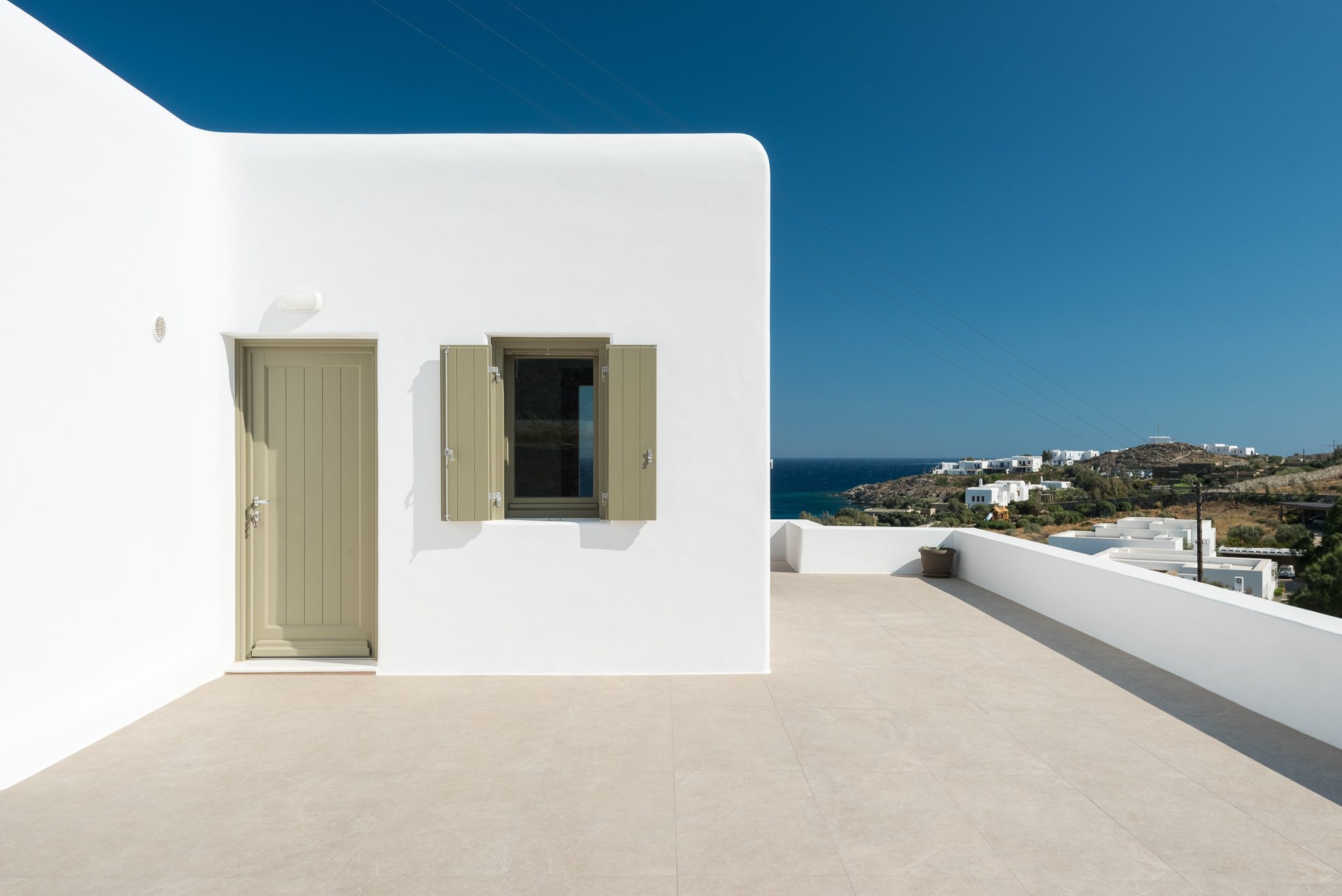 The most spacious of our three houses, Barbara’s House is designed for families and groups of up to four. Two private bedrooms, a generous living area with a sofa bed, and a wide terrace opening onto panoramic views of Ornos Bay — a setting where the hardest decision is whether to stay in or explore the island.